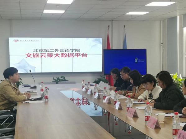 随后,调研小组参观了北京第二外国语学院中国文化和旅游大数据研究院。由研究院实验室主任敖民进行介绍、讲解。敖民介绍了中国文化和旅游大数据研究院的基本情况,并讲解了文旅云策大数据系统和辅助决策系统。调研小组就系统的具体数据获取方式、项目合作的具体企业以及项目在教学、科研、社会服务等方面所起到的作用进行了讨论,增强了对两个平台的功能、构成以及内部基本结构的了解,同时双方也就进一步进行合作的可能性进行了探讨。